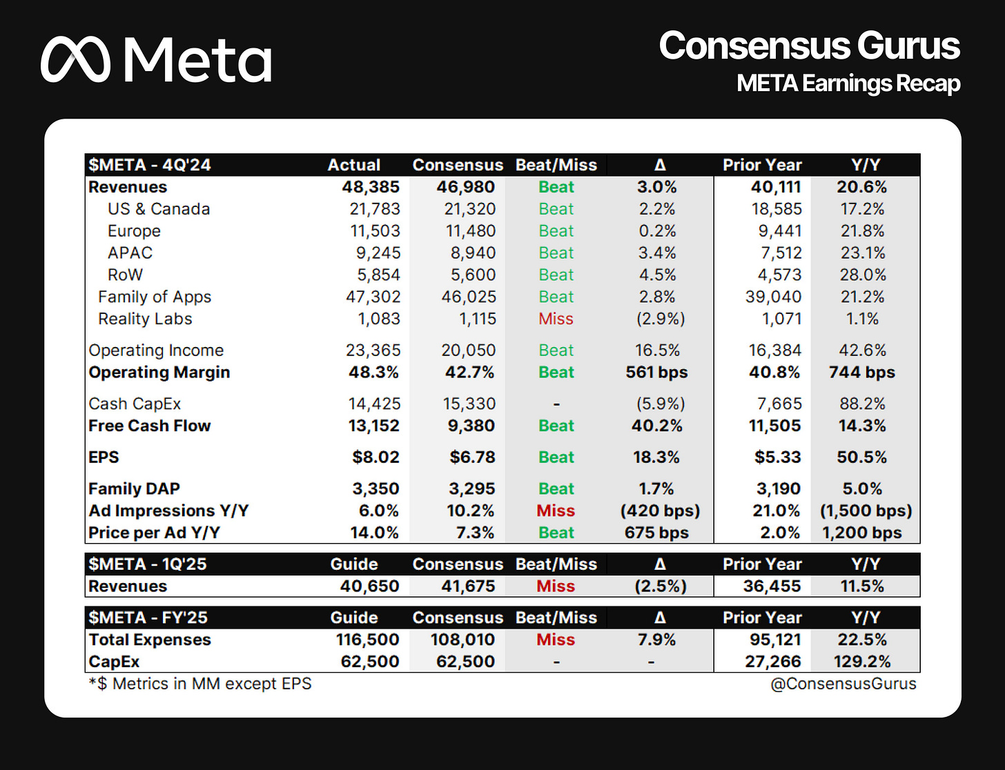 Meta’s earnings were gorgeous coming out of Q4’2024. With sizable beats on the top and bottom lines.